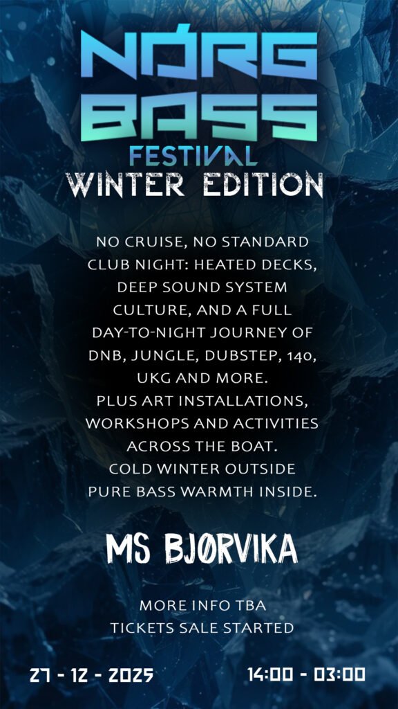When Oslo sinks into winter quiet and the Christmas rush wears off, Norgbass lights the city back up. Norgbass Festival: Winter Edition is our romjul flagship on the docked MS Bjørvika — two scenes from 14:00 till 03:00, built as a journey from daylight connection to deep-night pressure.
